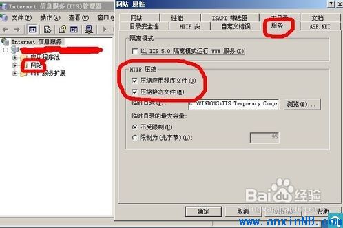 雙擊IIS服務(wù)器,右鍵點(diǎn)擊網(wǎng)站,點(diǎn)擊屬性,然后點(diǎn)擊服務(wù),我們看到HTTP壓縮,然后在壓縮應(yīng)用程序文件,壓縮靜態(tài)文件中打鉤,然后點(diǎn)擊確定,第一步就完成了