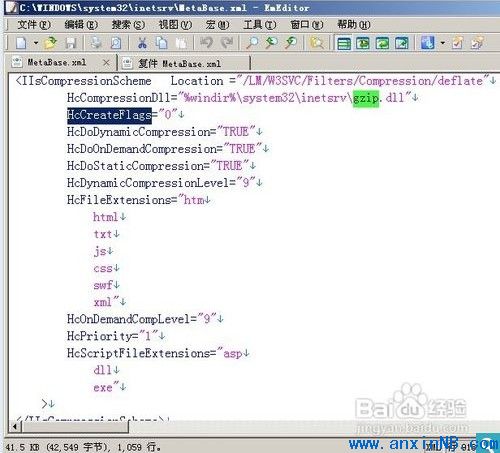 我們找到C:\WINDOWS\system32\inetsrv下的MetaBase.xml文件,操作這個(gè)文件之前應(yīng)該先復(fù)制一份,以免出現(xiàn)意外的情況.打開此文件,搜索deflate,找到HcDoStaticCompression原來(lái)為false改為true,HcDynamicCompressionLevel原來(lái)為0,改為9,HcFileExtensions里面就可以添加我們需要壓縮的后綴,這里添加的是靜態(tài)文件,一般壓縮html,js,css圖片不列為壓縮之列.動(dòng)態(tài)的文件可不可以壓縮呢,當(dāng)然可以HcScriptFileExtensions里面就是填寫要壓縮的動(dòng)態(tài)文件.配置完這個(gè),我們要來(lái)配置下面的gzip,他們兩個(gè)緊挨著的,配置方法相同.