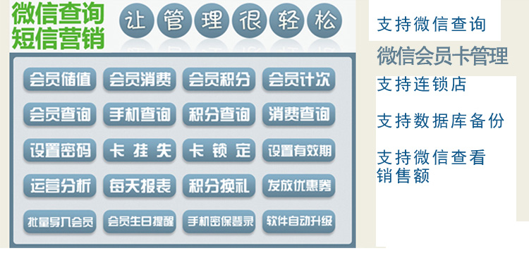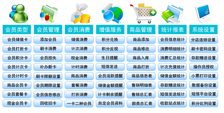 軟件可以儲值、積分、打折、計次、計時、會員管理、商品管理、商品進銷存、生日提醒、發送信息等等功能。