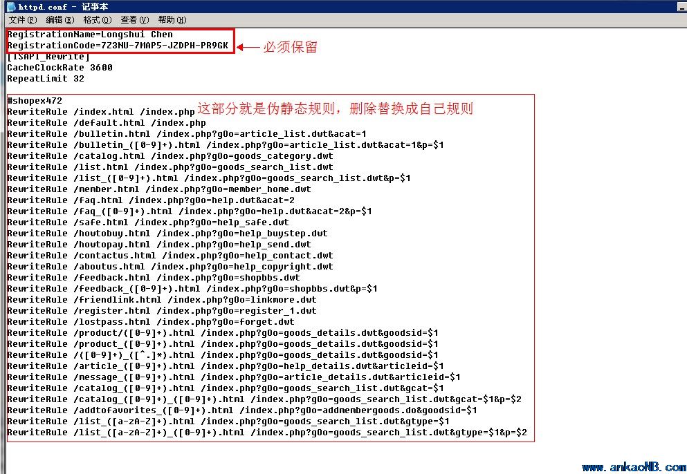 2、開啟以后,用記事本打開編輯修改網站目錄others里面的httpd.conf,這里以站點名為ankaonb舉例,文件路徑就是D:\wwwroot\ankaonb\others,注意httpd.conf里面頂部兩行不能替換,規則替換為自己的即可。