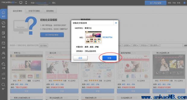 走到這一步,建站過程基本上就完成了一半,進入你的網站后臺,首先第一步就要在建站寶盒提供的上千套網站模板中挑選一套你中意的模板了,模板提供預覽功能,看重之后,點擊模板下方的“安裝”鍵,開始安裝。