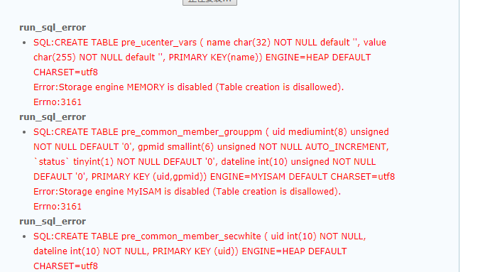 但是我們在安裝discuz 最新版3.4的時候默認是 engine =myisam會出現下圖報錯